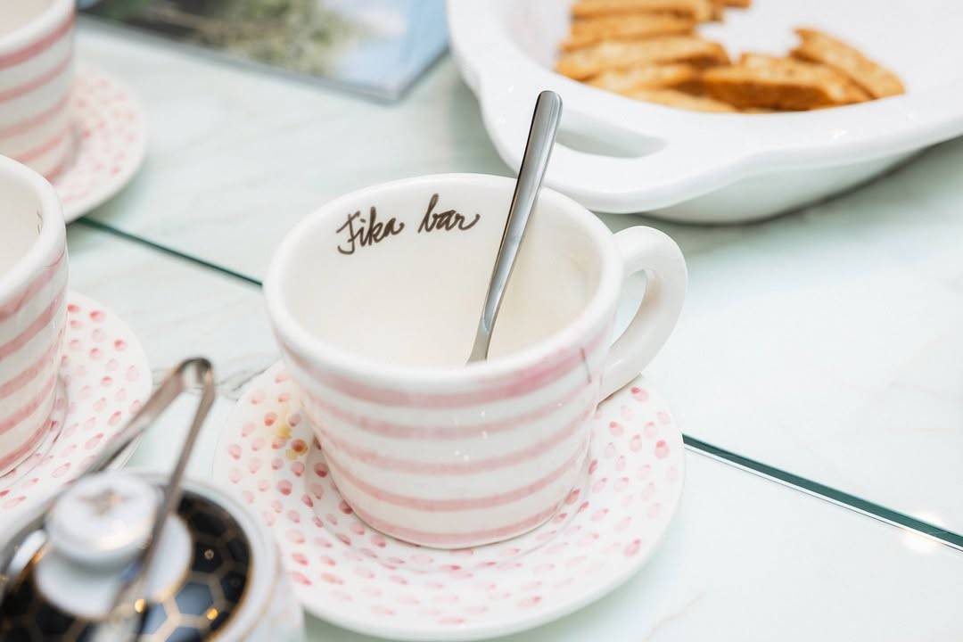 Designer Agneta Livijn recently collaborated with Eleish Van Breems in Westport, Connecticut, to create an exclusive ceramic line for their new coffee corner, “Fika Bar.” Inspired by the Swedish art of taking a break together, the collection features pink-striped cups and matching polka-dotted saucers — a joyful nod to Scandinavian simplicity and warmth.