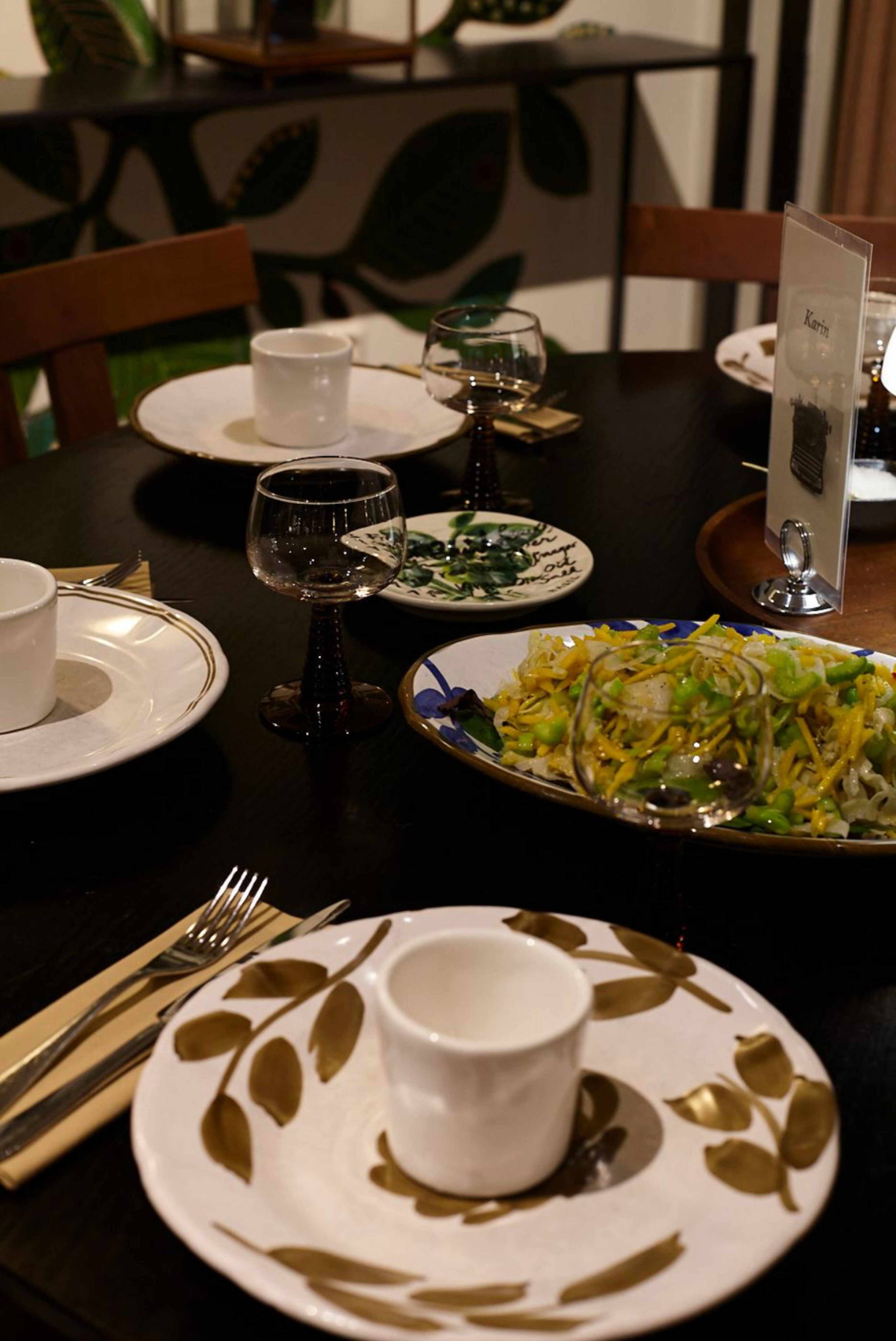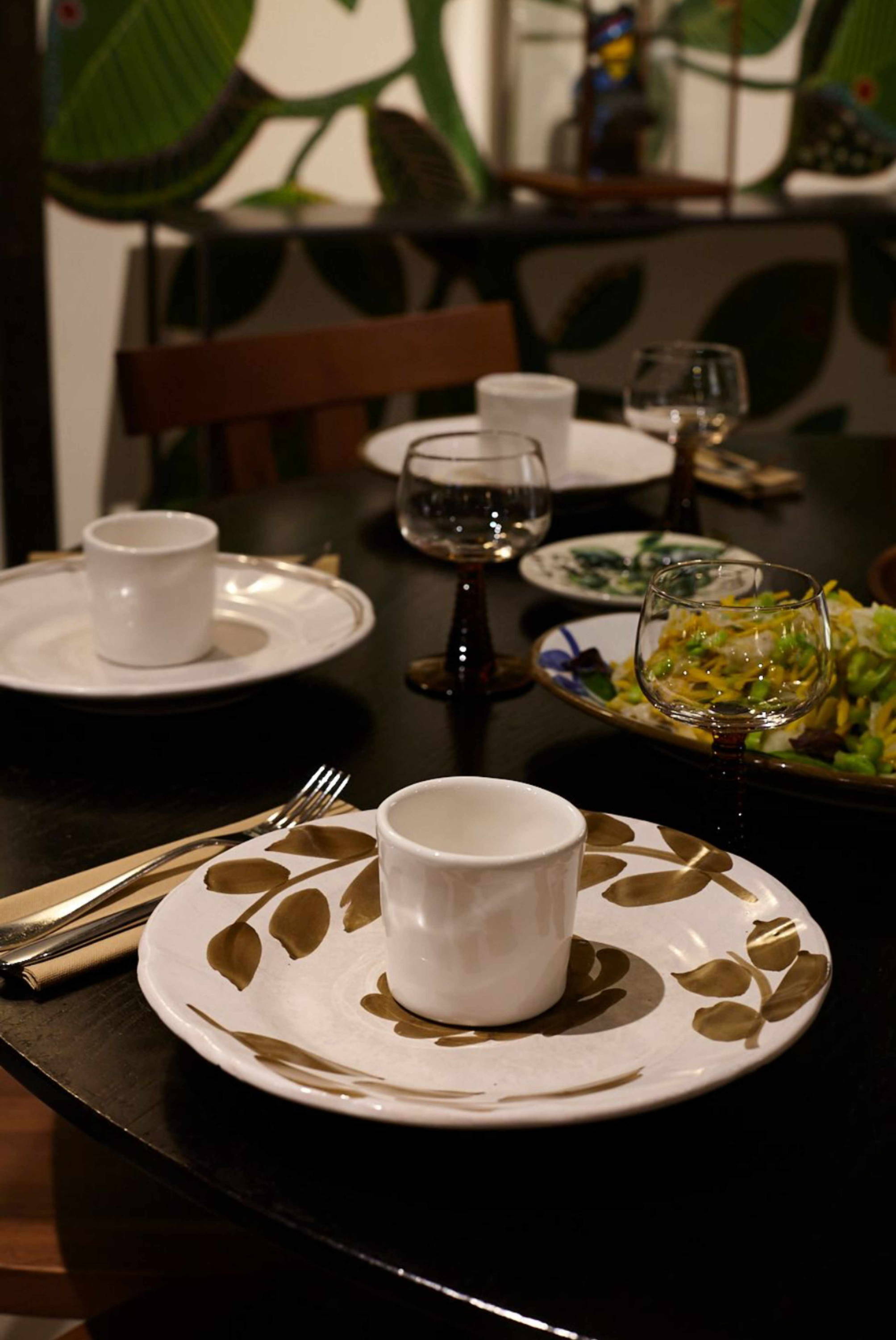 The scene speaks for itself: hand-painted plates with organic leaf motifs catching the warm glow of the room, and dishes that turn every meal into a visual experience. Each piece reflects Agneta’s timeless aesthetic, natural, expressive, and beautifully imperfect.